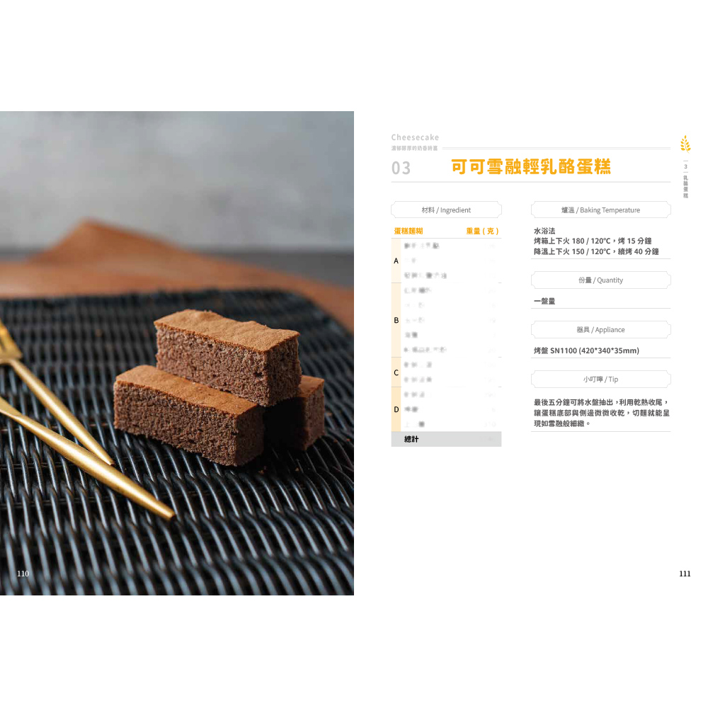 「幸福」,許家齊老師深信,烘焙不只是技術的展現,更是情感的傳遞與生活美學的體現。書中分為六大章節:戚風蛋糕、裝飾蛋糕、乳酪蛋糕、派塔、司康以及可麗露,每一類都從經典基礎出發,延伸至創新變化。從經典配方到融合東方韻味的口味,展現了作者對於風味層次的深刻理解。