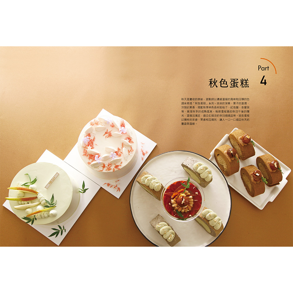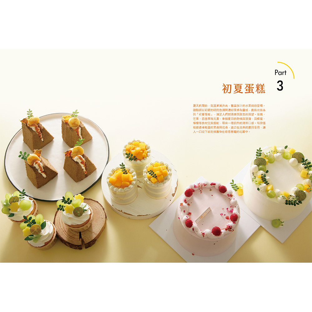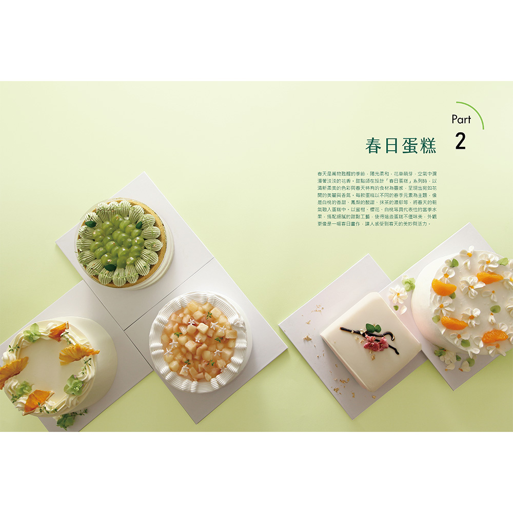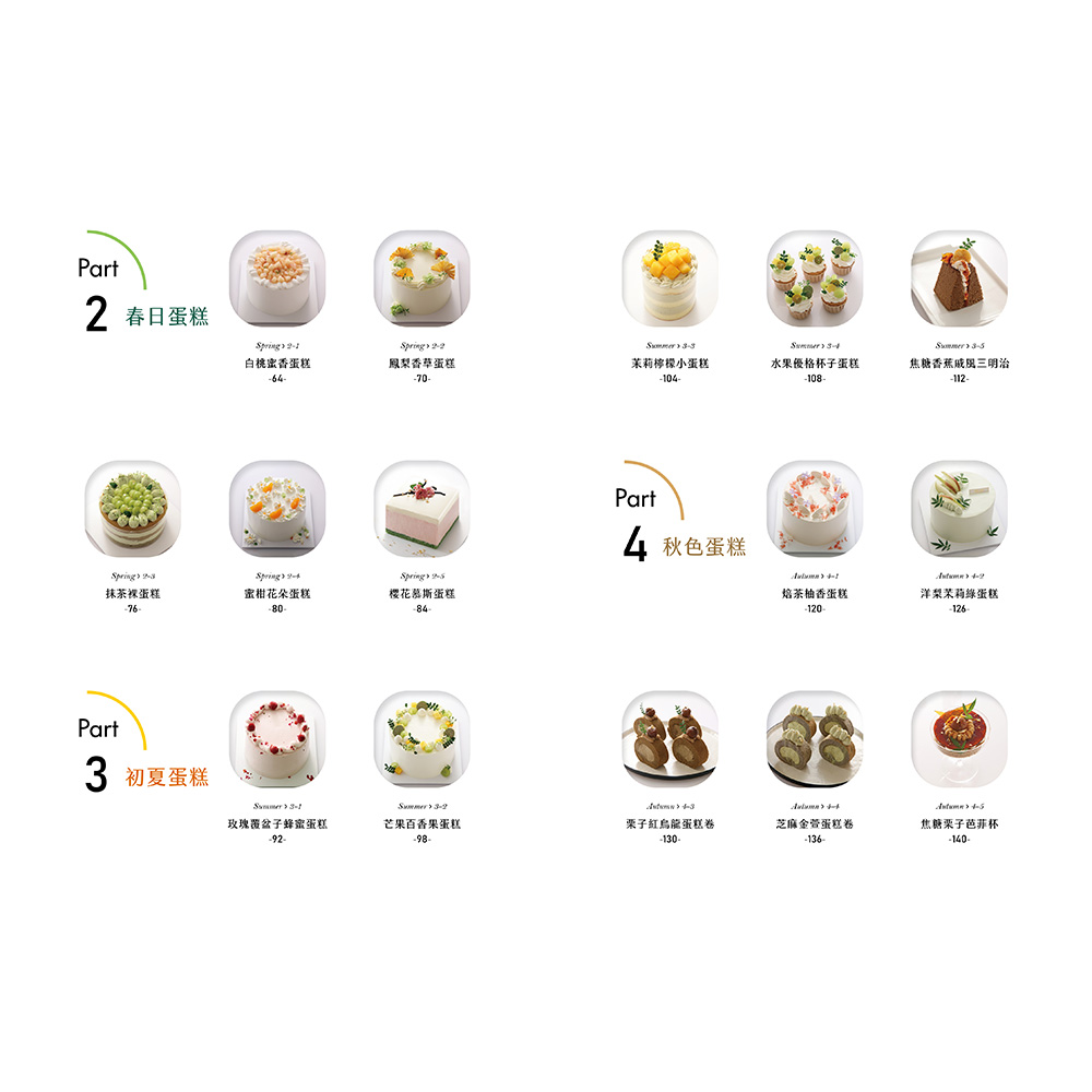 後四章依照春夏秋冬依序排列,以對應季節的蛋糕體進行裝飾,收錄針對不同季節特色的裝飾技巧及創意靈感。例如:春季收錄以鮮花為主題的蛋糕,細緻描繪了如何利用新鮮的食用花卉與季節水果,打造充滿春意的蛋糕作品;夏季則強調清涼感和色彩繽紛的水果裝飾,教你如何用多汁的莓果和熱帶水果,製作出令人耳目一新的蛋糕造型。
