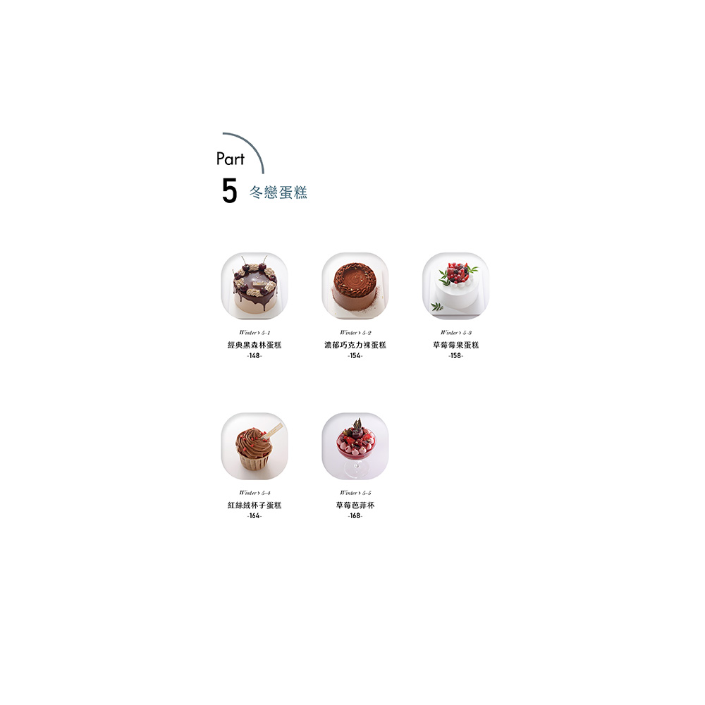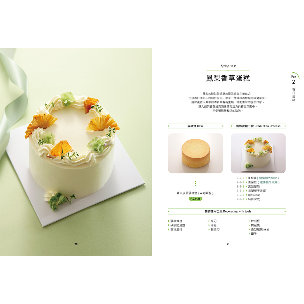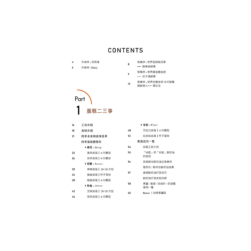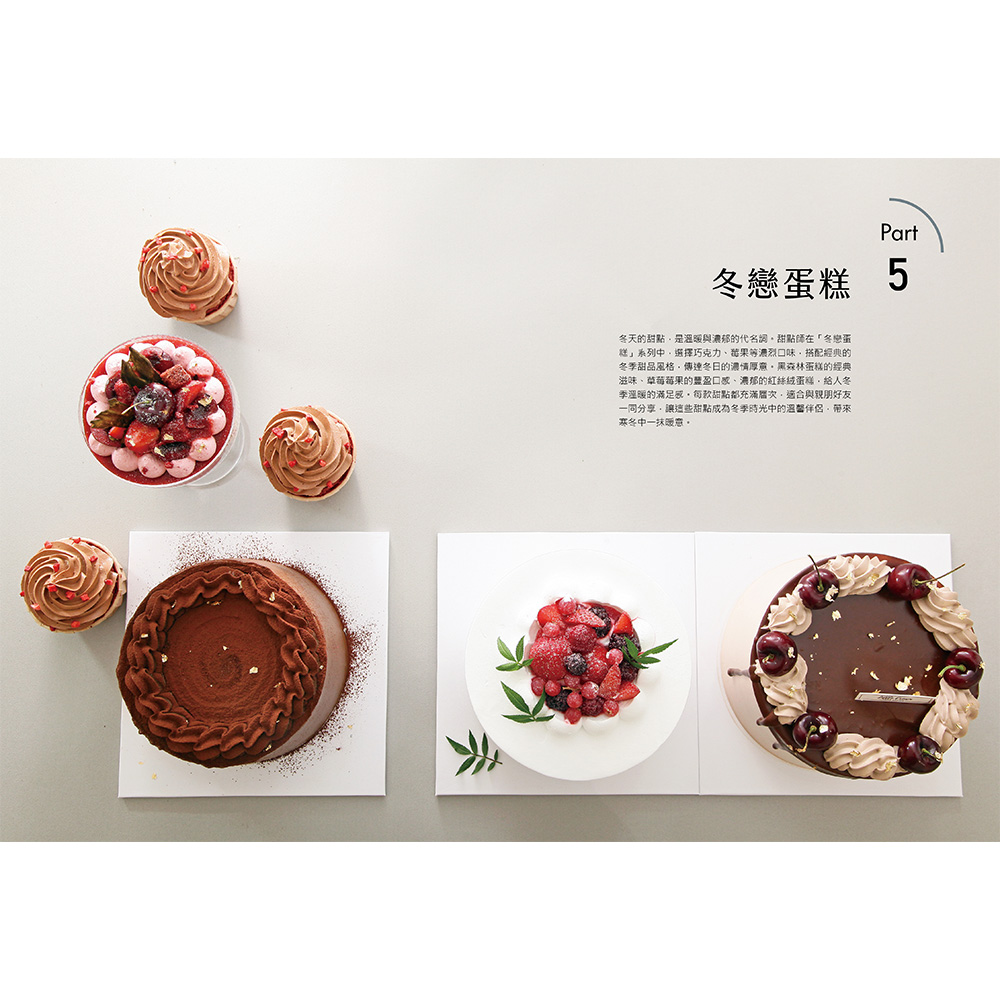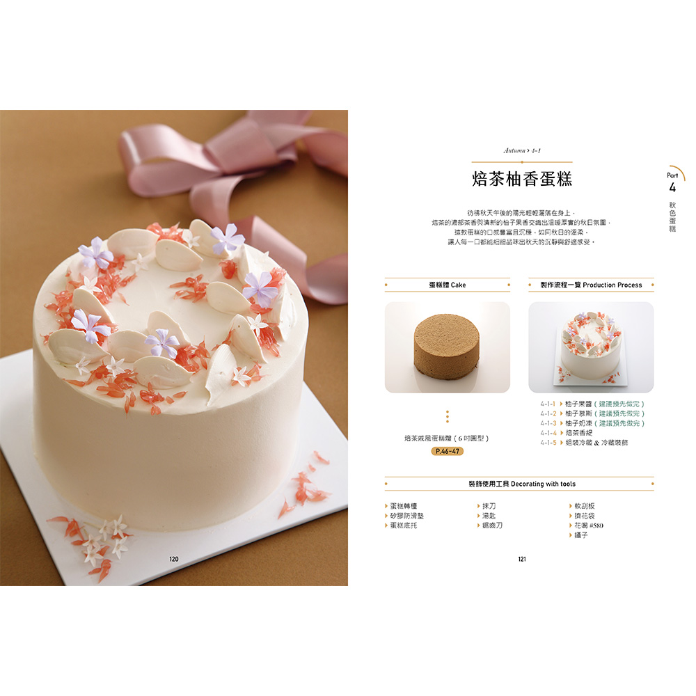 後四章依照春夏秋冬依序排列,以對應季節的蛋糕體進行裝飾,收錄針對不同季節特色的裝飾技巧及創意靈感。例如:春季收錄以鮮花為主題的蛋糕,細緻描繪了如何利用新鮮的食用花卉與季節水果,打造充滿春意的蛋糕作品;夏季則強調清涼感和色彩繽紛的水果裝飾,教你如何用多汁的莓果和熱帶水果,製作出令人耳目一新的蛋糕造型。