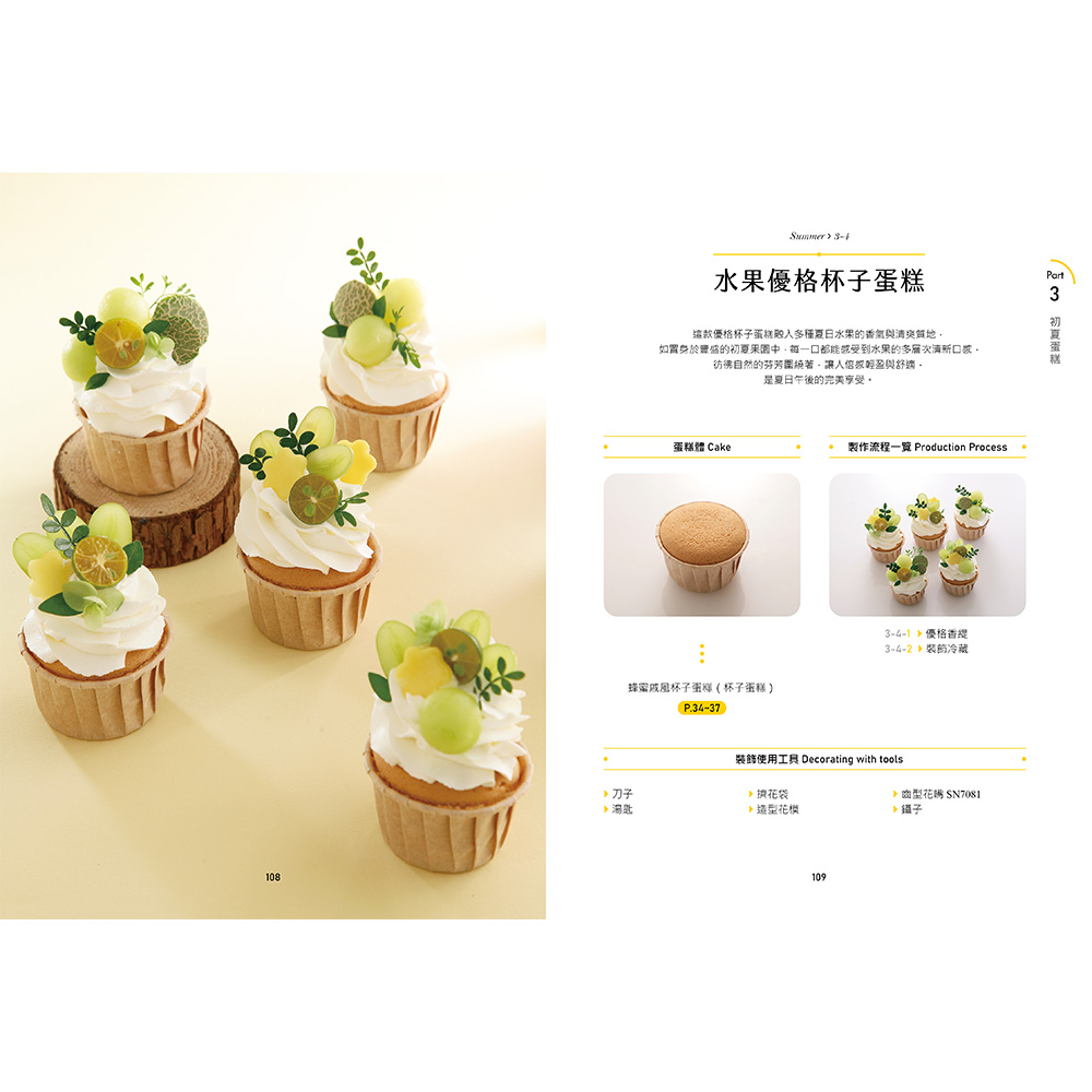 第一章從材料工具介紹、四季蛋糕體製作談到實務技巧一覽。帶領讀者了解鮮奶油蛋糕裝飾所需的基本材料器具、製作蛋糕體的方法,與打發鮮奶油各式技巧。